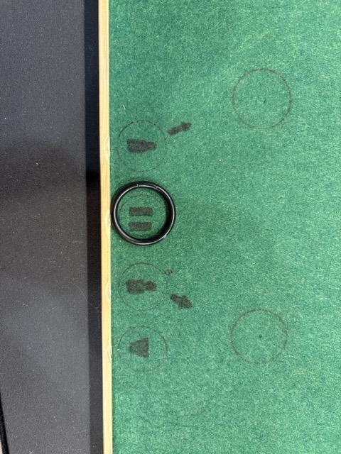 - I built a light weight tray for the bottles to sit on out of 1/8 in plywood and outside corner molding. The tray is marked with my bottle placement for the routine. I also have visual cues for Bill to know what bottle to lift when. I move a small ring to prompt him for the next step in the routine.