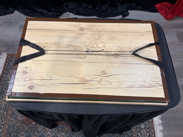 To use, the props are all in starting position with the box keeping everything in its place. I use a small cloth to cover the protruding bottles. To perform the box is simply lifted over everything and set aside. Once the performance is complete a few minor adjustments are made to the bottles on the table and than the box is carefully placed over the standing bottles and the entire table can be moved without fear of the bottles tipping.