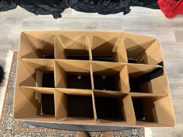 If you want to build one of these, it is very easy. The box is bottomless. Notice the dividers are free floating and only are fastened to the outside box at one point. This ensure it can freely fold with minimal fuss.